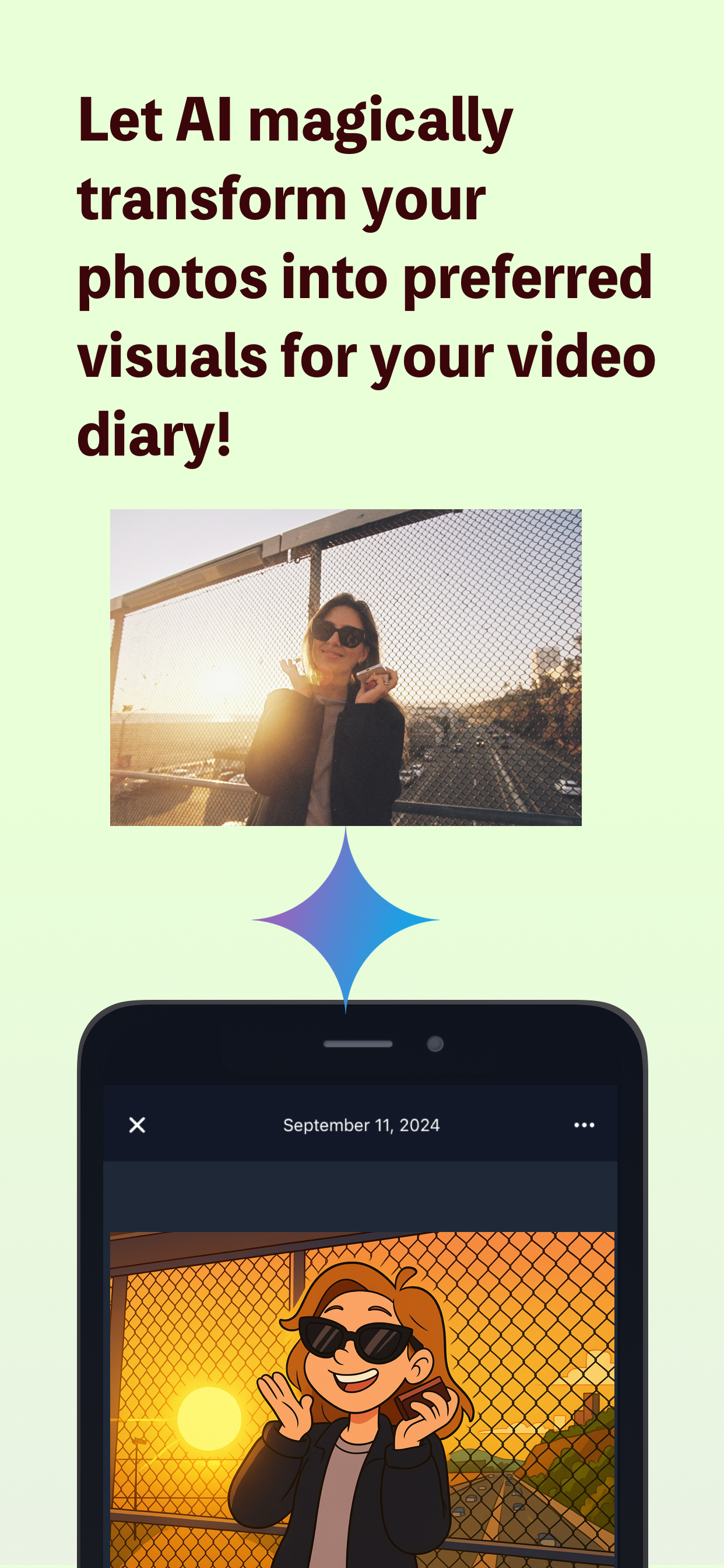 Simply choose up to 3 photos, pick your mood, and watch the magic happen. AI creates your personalized video diary in minutes.